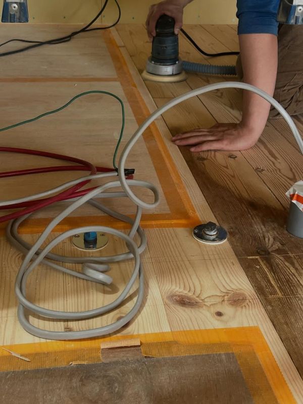 築24年の無垢の床板を研磨中。