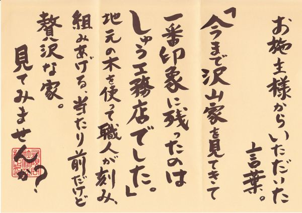 8月29.30日は、須坂市にて外断熱エアサイクル工法の構造見学会を開催いたします。 完成してしまうと見えなくなってしまう部分こそ、見ていただきたい部分なのです。 予約制となっておりますので、ご興味のある方はご都合をお聞かせください。 また、両日都合が悪い方もご相談ください。 前後で日時の設定いたします。