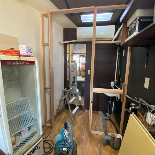 店舗改装工事、トイレの前に壁を作って...