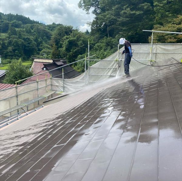 M邸にて、 今日から塗装工事が始まりました。 ケレンをして高圧洗浄機で洗浄しています。 この場所は雪が沢山降るので、自然に雪が落ちる材料を塗ります。